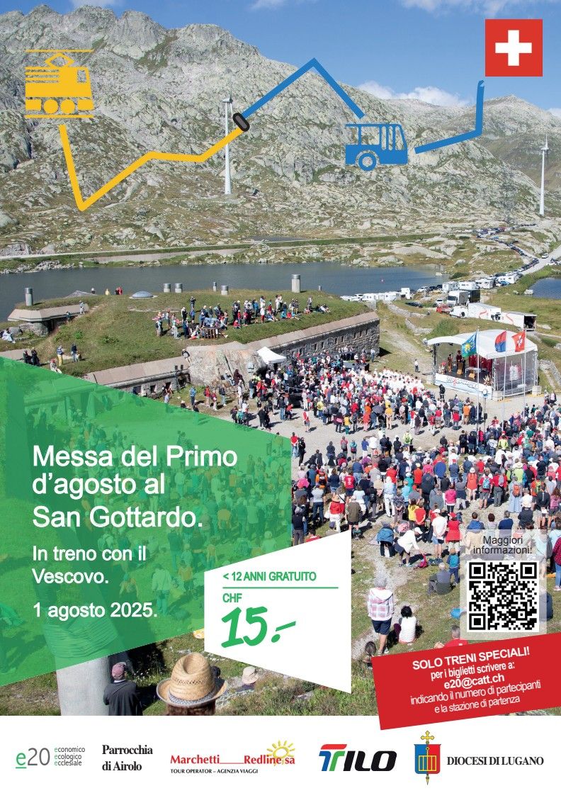Anche quest’anno, per raggiungere il Gottardo per la festa nazionale, ci sono tre treni speciali in partenza da Chiasso, Lugano e Locarno. Il biglietto dal costo di 15 CHF.- (gratis fino ai 16 anni) è acquistabile in diverse modalità: scrivendo all’indirizzo email e20@catt.ch con i propri dati, telefonando al numero 091 225 41 10, oppure scrivendo per posta all’indirizzo e20, Via Cantonale 2A, 6900 Lugano.