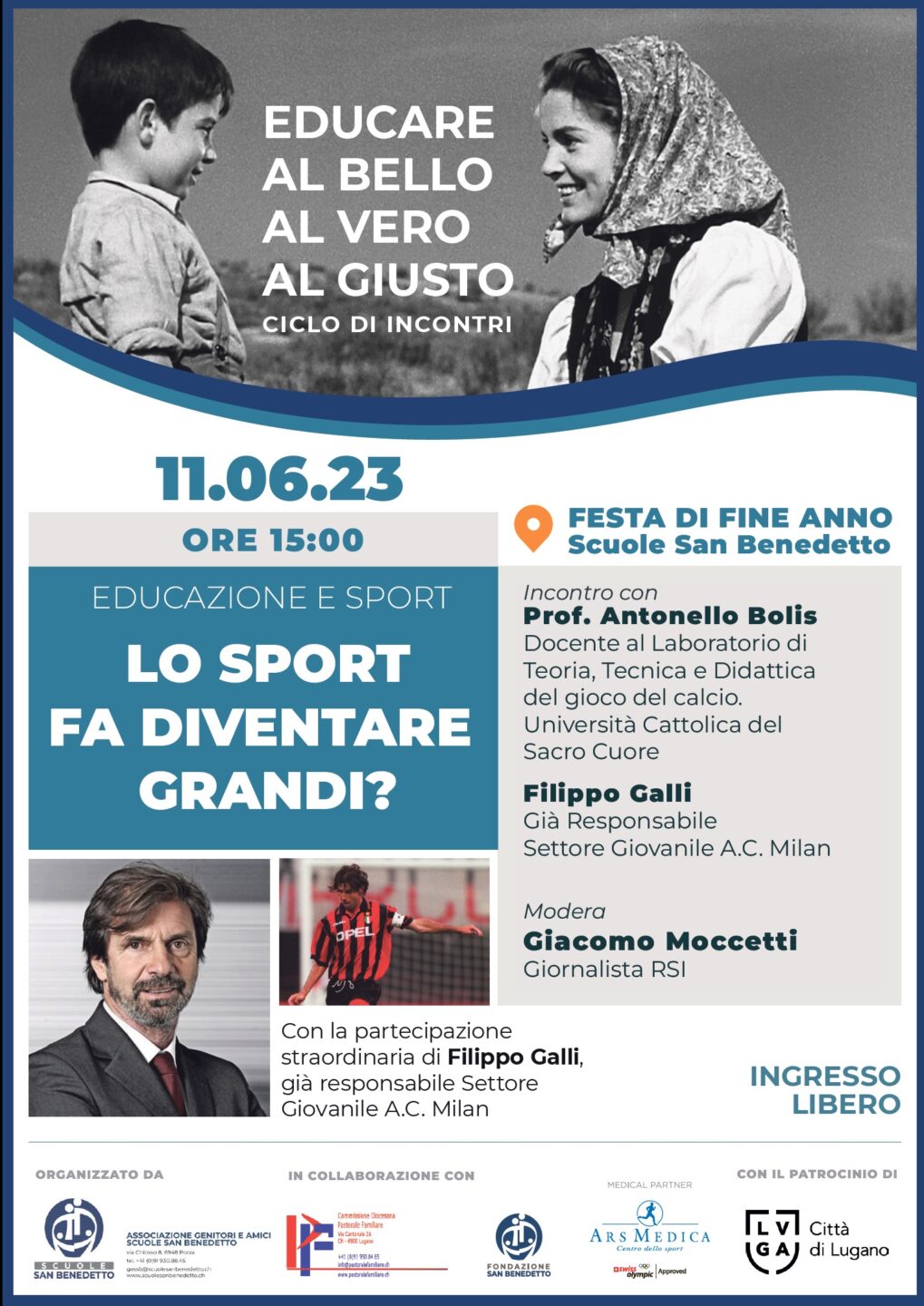 "Lo sport fa diventare grandi?" E’ questo l’interrogativo del prossimo e ultimo incontro del ciclo promosso dall’Associazione Genitori e Amici delle Scuole San Benedetto sul tema dell’educazione. Per l’ultimo appuntamento, che si terrà domenica 11 giugno, alle ore 15, presso le scuole San Benedetto (zona Lugano-Resega) sono previsti gli interventi di ospiti internazionali di grande rilievo: Filippo Galli, difensore della AC Milan dal 1983 al 1996 - con il quale ha vinto 5 scudetti e 3 Champion League, e il prof. Antonello Bolis, docente al Laboratorio di Teoria, Tecnica e Didattica del gioco del calcio all'Università Cattolica di Milano. Il dibattito sarà moderato da un volto noto della RSI, il giornalista sportivo Giacomo Moccetti, e approfondirà il tema educativo in relazione allo sport. L'evento è patrocinato dalla Città di Lugano e avrà Ars medica quale Medical Partner. Abbiamo rivolto al prof. Bolis alcune domande per approfondire meglio il valore dello sport.