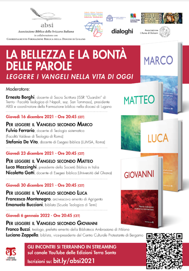 È intitolato "La bellezza e la bontà delle parole. Leggere i Vangeli nella vita di oggi" il nuovo ciclo di incontri proposto dall'Associazione biblica della Svizzera italiana (ABSI), congiuntamente alla Federazione Biblica Cattolica, alla Società Biblica in Italia, alla United Bible Societies, alla rivista "Dialoghi", e all'Associazione "L'Asina di Balaam", dedicato alla lettura e all'approfondimento dei quattro Vangeli.