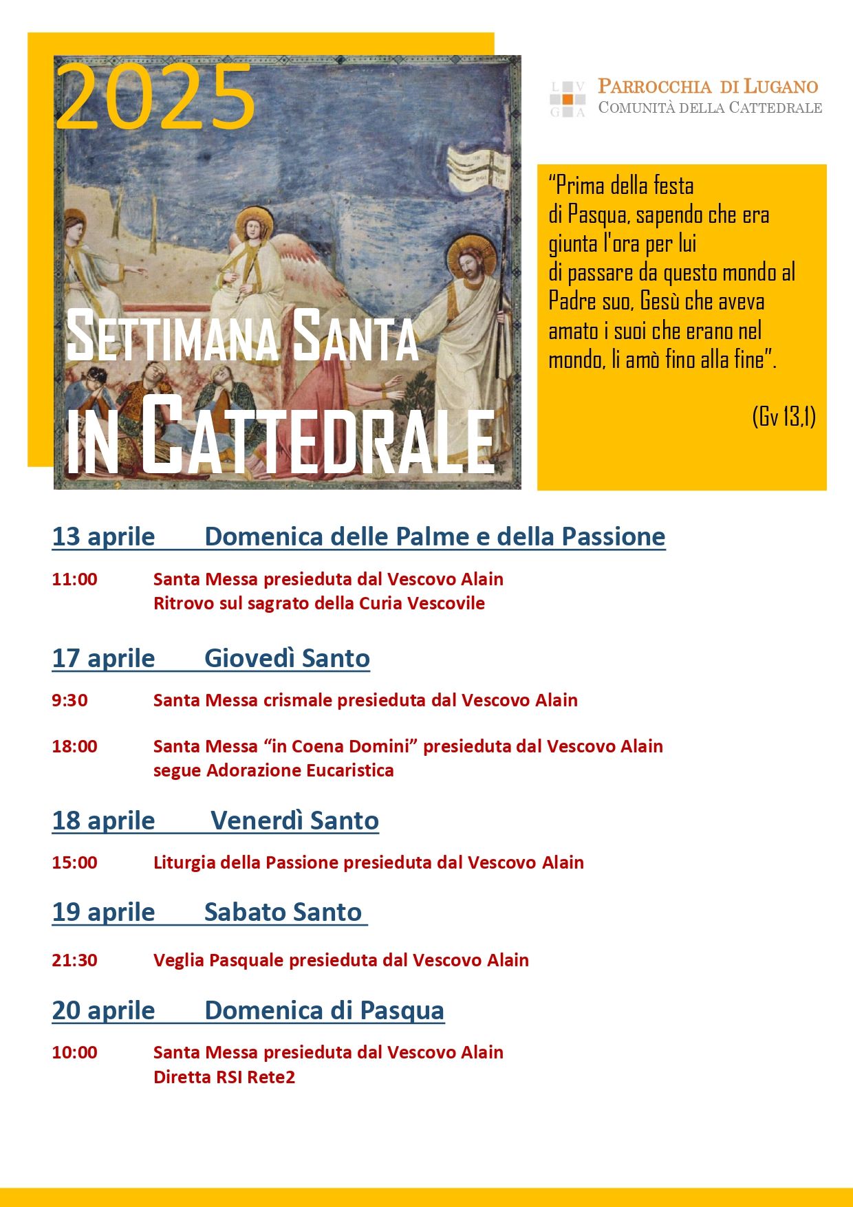 Il 18 aprile, Venerdì Santo, in Cattedrale alle 15 Liturgia della Passione. Successivamente, alle ore 20.00, presiede la Via Crucis per le vie di Lugano, dalla Cattedrale alla chiesa di Santa Maria degli Angioli.