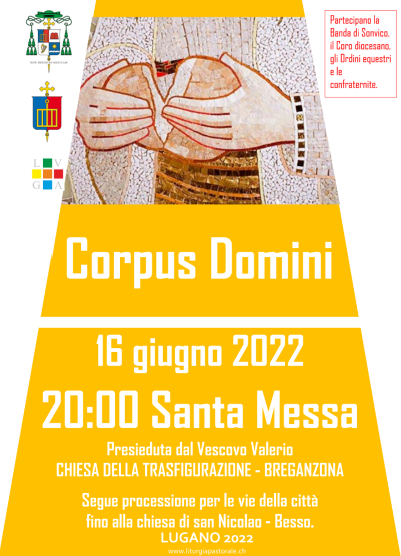 Giovedì 16 giugno 2022, in occasione della Solennità del Corpus Domini, Mons. Vescovo Valerio presiederà la solenne Celebrazione eucaristica nel giardino della chiesa della Trasfigurazione a Breganzona, alle ore 20. Seguirà la processione che si snoderà attraverso le vie dei quartieri di Breganzona e Besso, sino a giungere nella chiesa di san Nicolao di Besso.