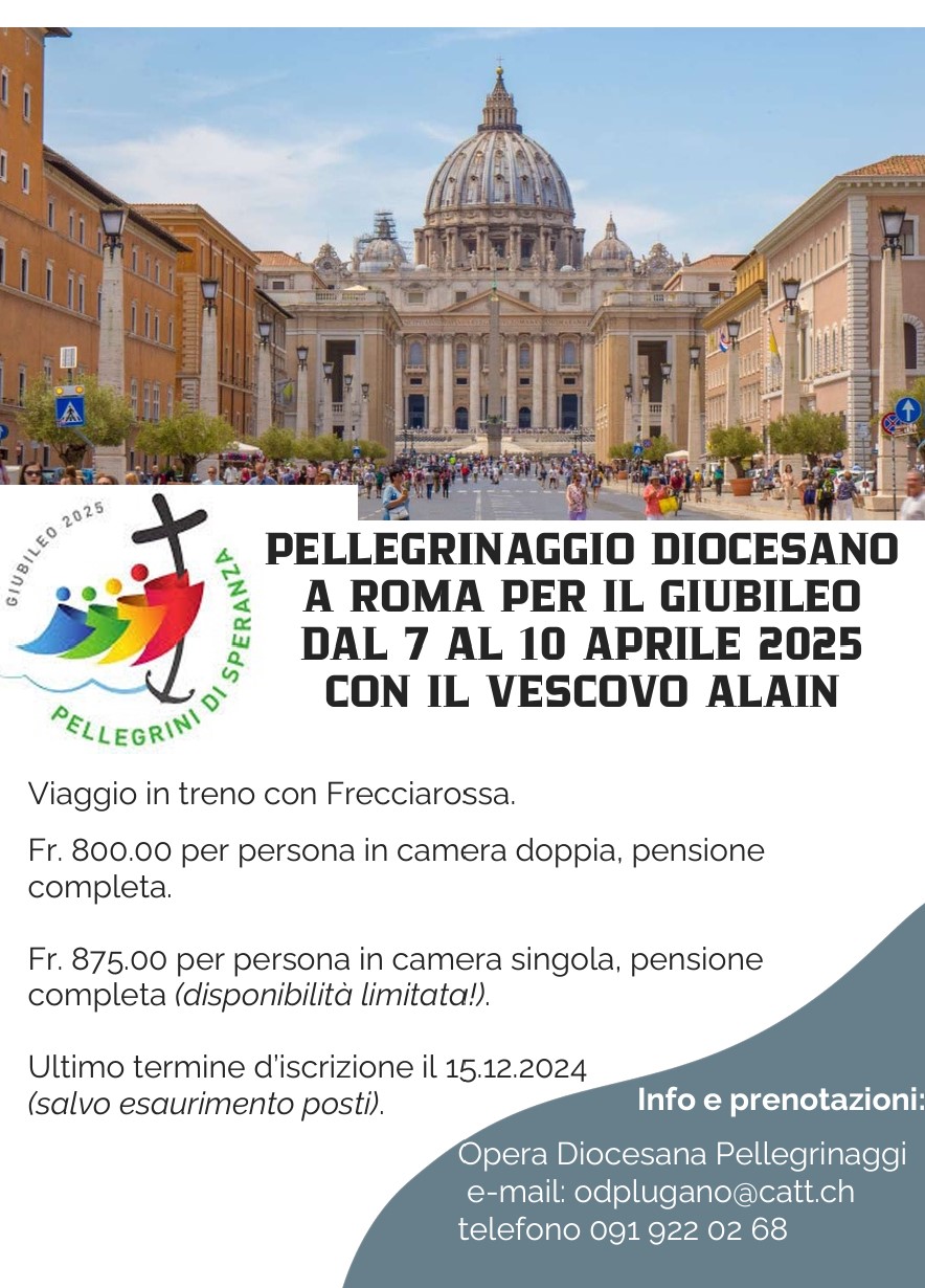 Un grande evento di fede e fraternità segnato dal tema giubilare di una «speranza che non delude» attende i ticinesi nell’Anno Santo del 2025: il pellegrinaggio diocesano a Roma guidati dal vescovo Alain, occasione speciale per attraversare la Porta Santa, dato che nel 2025 le uniche Porte Sante saranno a Roma e non ne verranno aperte nelle diocesi.