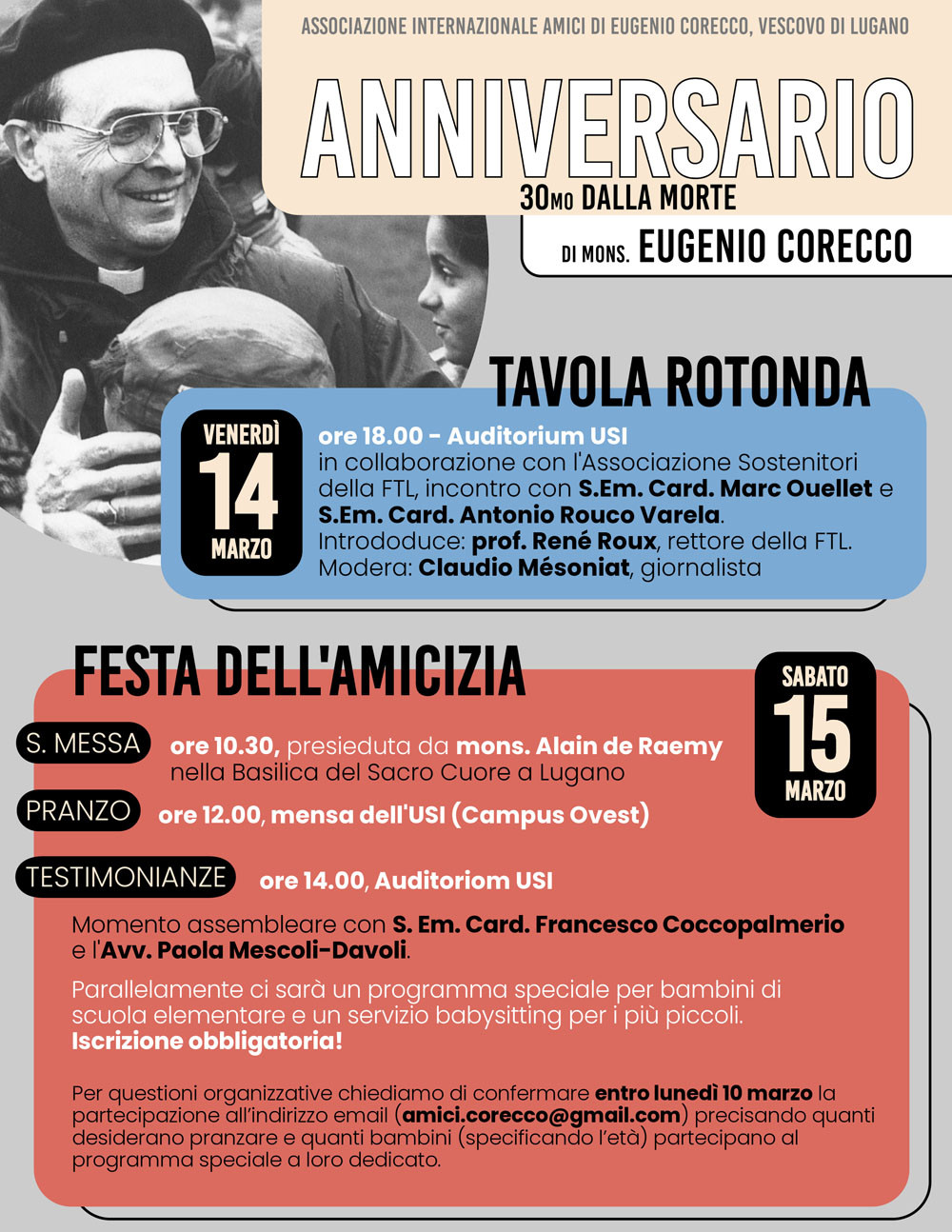 Oltre alla tavola rotonda del 14 marzo alle 18 all’USI, per ricordare mons. Corecco è previsto sabato 15 marzo, alle 10.30, una Messa, presieduta da mons. de Raemy nella basilica del Sacro Cuore a Lugano; segue alle 12 un pranzo comunitario alla mensa USI.