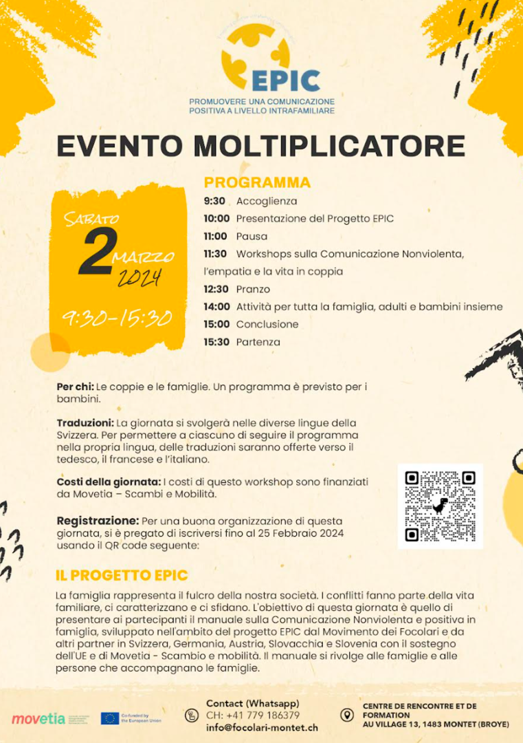 Sabato 2 marzo, al centro d'incontro e formazione di Montet nel Canton Friburgo, ci sarà una giornata aperta a tutte le famiglie - e per chi lavora con le famiglie - per presentare il manuale finale del progetto EPIC (Enabling Positive Intrafamily Communication) e una serie di strumenti digitali per la formazione. "EPIC è un progetto finanziato dalla Comunità Europea (attraverso il programma Erasmus+) - ci racconta André Heeren, del movimento dei Focolari e residente a Montet - che ha coinvolto il Movimento dei Focolari della Germania, Austria, Slovenia, Slovacchia e Svizzera. L'obiettivo è stato imparare a utilizzare diversi strumenti per prevenire, ridurre o risolvere i conflitti nelle famiglie e nei piccoli gruppi sociali. E' stato un lavoro intenso, vissuto in un clima fraterno che ha portato molti frutti".
