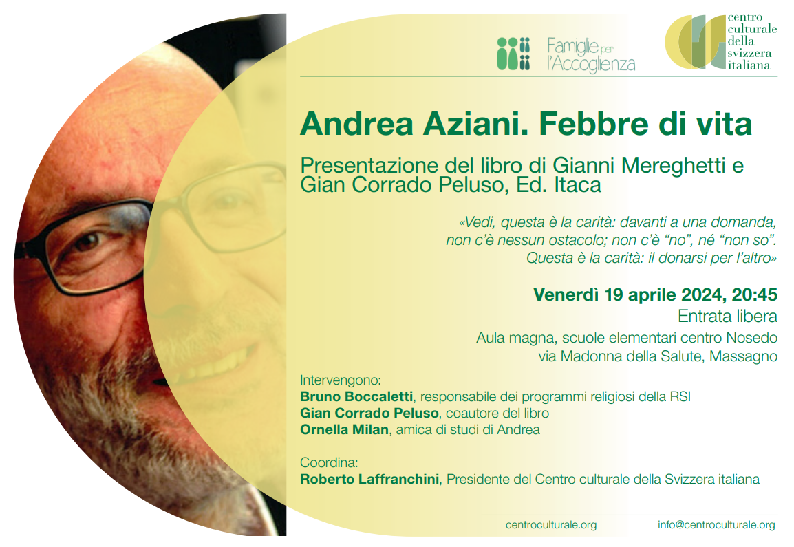 Alla serata di presentazione del libro, organizzata da Famiglie per l’Accoglienza e il Centro Culturale della Svizzera Italiana, uno degli autori del libro (Gian Corrado Peluso) e una amica di studi di Andrea (Ornella Milan) dialogheranno con Bruno Boccaletti, responsabile dei programmi religiosi della RSI.