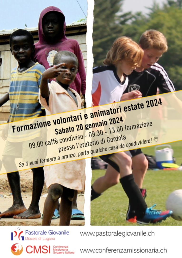 La Conferenza Missionaria della Svizzera Italiana (CMSI), in collaborazione con la Pastorale Giovanile (PG), organizza un primo incontro di formazione al volontariato sabato 20 gennaio, alle 9:00, a Gordola. È aperto a tutti i giovani interessati ad essere animatori di una colonia estiva/GREST, ma anche a chi, senza distinzione d'età, fosse attirato da un'esperienza di volontariato internazionale nell'ambito della collaborazione missionaria (campo estivo di 3 settimane). I dettagli sulle date del campo estivo e la meta saranno comunicate in un secondo tempo, ovvero durante gli incontri di formazione stessi, questo perché la CMSI desidera incentivare il desiderio di partire in missione indipendentemente dalla meta.