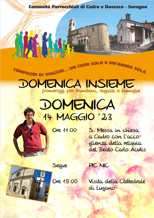 Alcuni bambini della prima comunione con le loro famiglie, delle Parrocchie di Cadro e Davesco-Soragno, accompagnati dal parroco don Davide Droghini, si sono di recente recati in pellegrinaggio ad Assisi sulle orme di S. Francesco, Santa Chiara e di un giovane Beato, caro alle nuove generazioni: Carlo Acutis (1991 – 2006). Domenica 14 maggio, con una Santa Messa nella Chiesa di Cadro, la reliquia sarà accolta ed esposta.