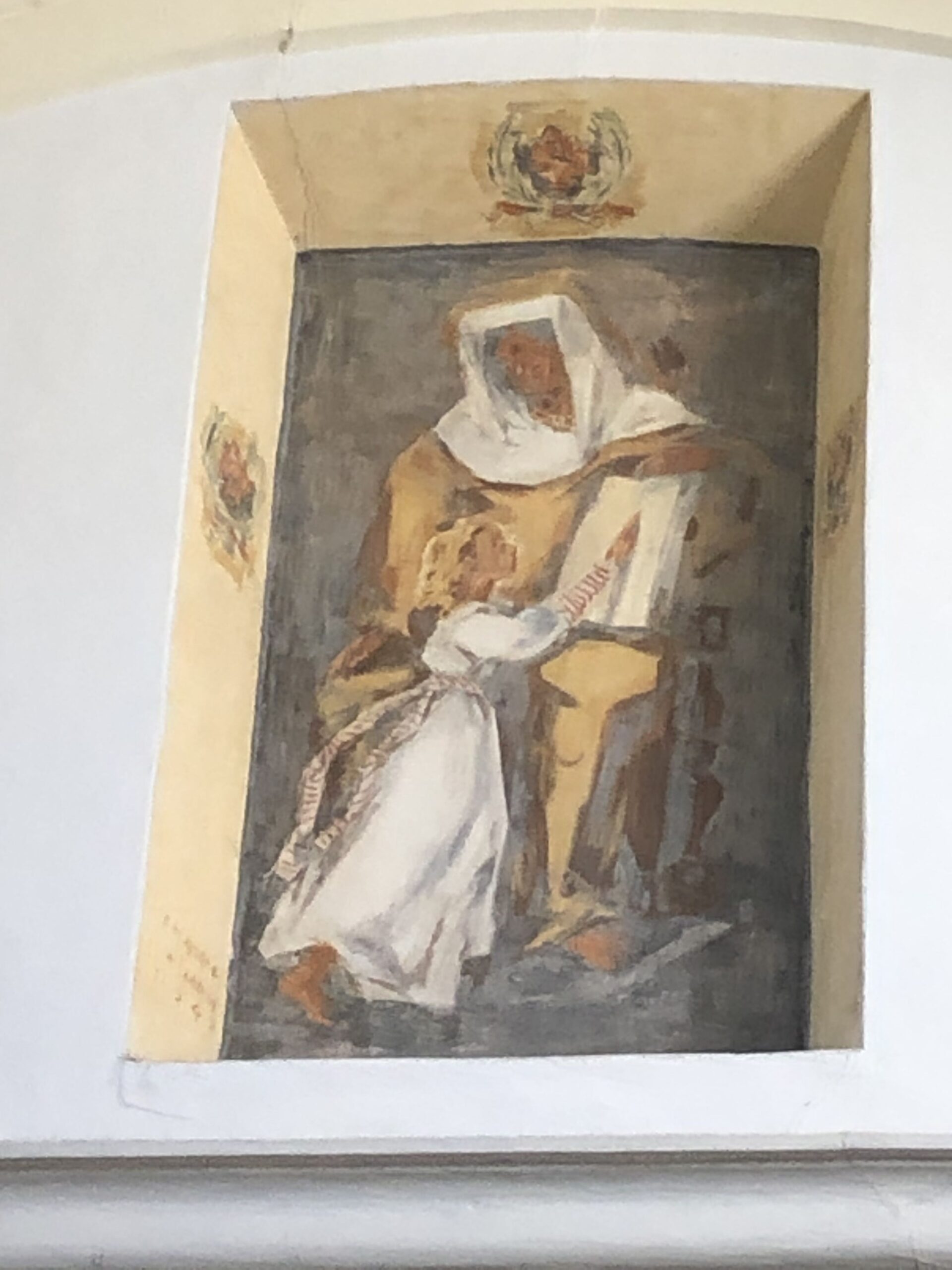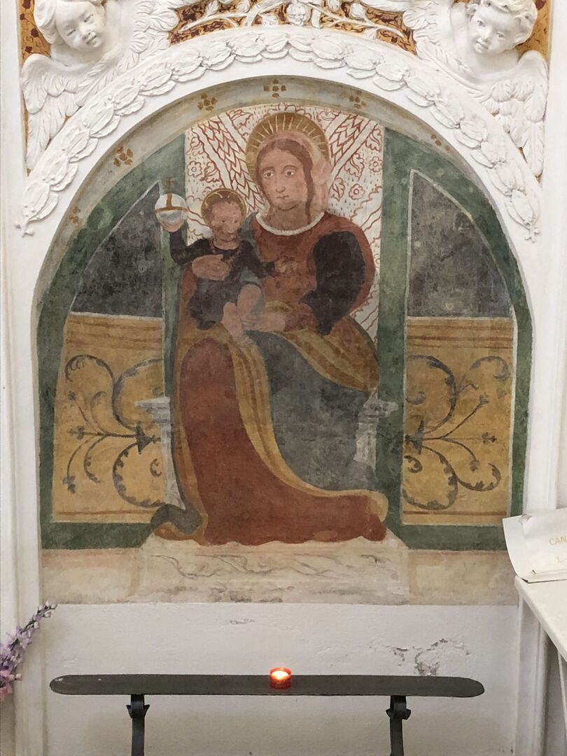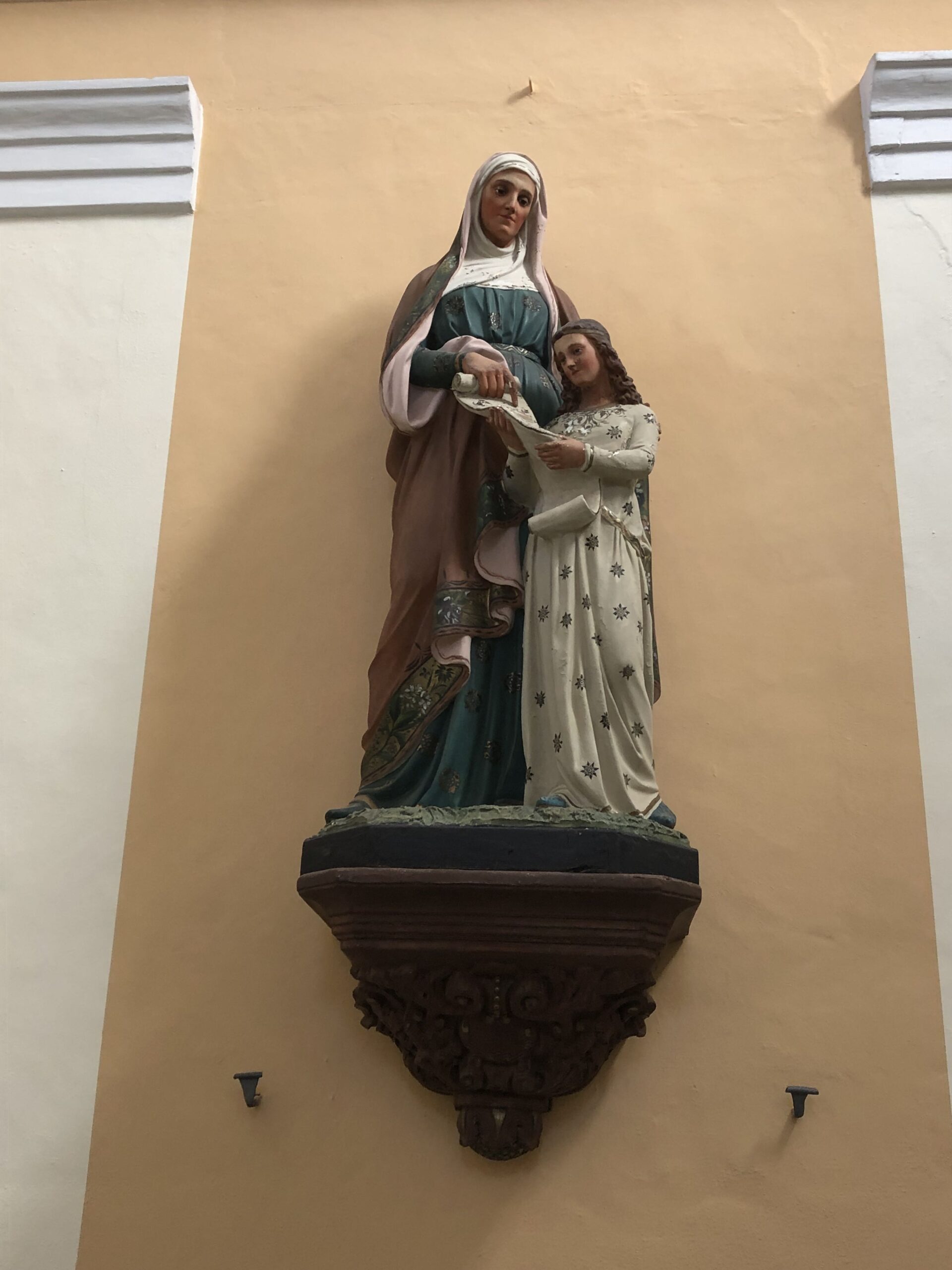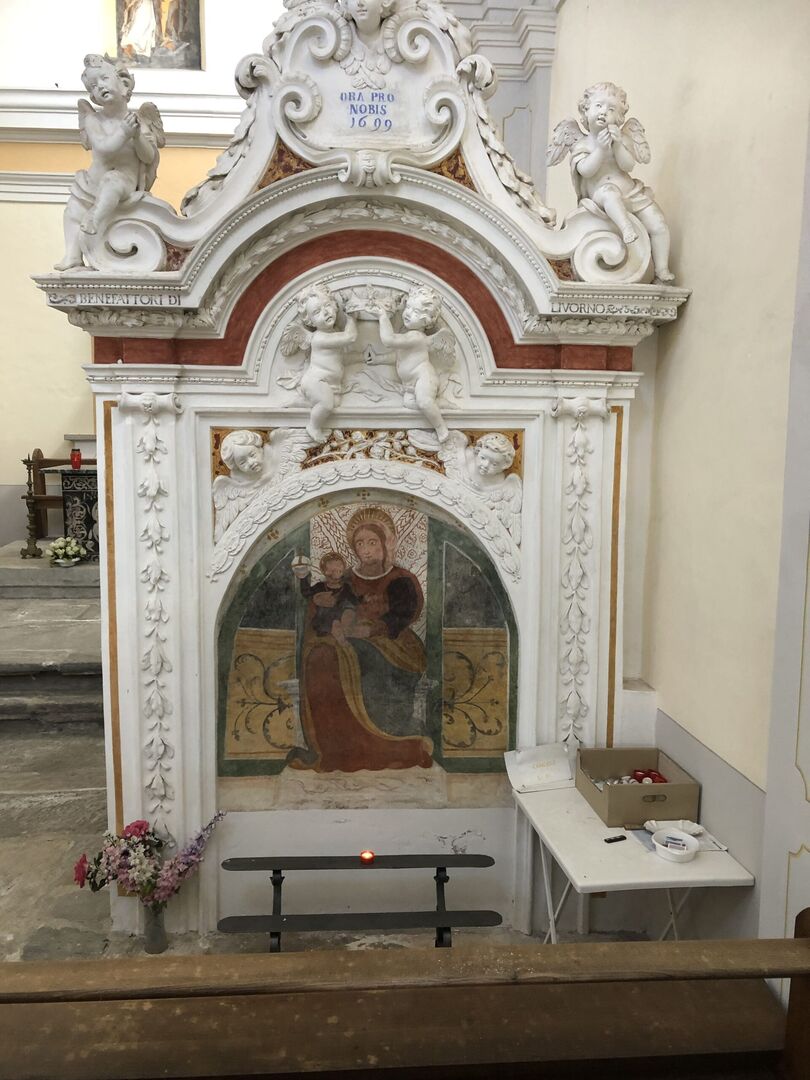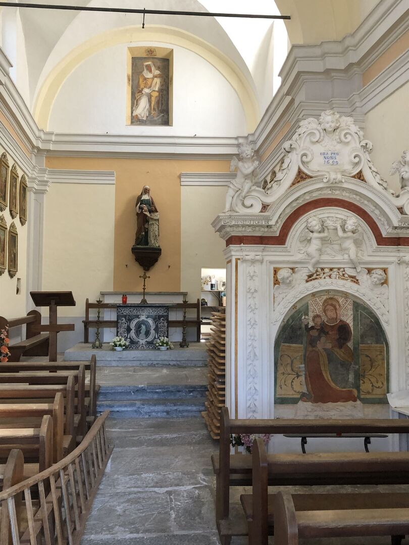 Una partecipazione sentita dovuta anche al significato dell’edificio, legato alla storia migratoria della zona e verosimilmente fatto edificare da emigranti Tegnesi a Roma all’inizio del XVII secolo, attorno alla cappella cinquecentesca ben conservata e ancora presente al suo interno. Ai lati della porta dell’edificio – che viene chiamato oratorio delle Scalate, in relazione ai numerosi scalini sul sentiero per raggiungerlo – due finestrelle consentono di scrutare l’interno e di sostare in preghiera. Sulla destra si ammira il tabernacolo barocco del 1699, voluto dai benefattori di Livorno e che ingloba l’antico affresco della Vergine in trono col Bambino della primitiva cappella. Dietro l’altare spicca la statua di S. Anna che istruisce la Madonna, restaurata nel 2016, mentre sopra è presente un dipinto raffigurante S. Anna con Maria bambina, eseguito nel 1947 dal pittore locarnese Emilio Maria Beretta. Testimonianza di quanto questo luogo fosse caro alla popolazione sono i dipinti portati lassù, ma poi trasferiti nella parrocchiale di Tegna a causa dell’umidità: la pala dell’altare con il Miracolo della neve a Roma, la tela di S. Antonio da Padova con Gesù bambino e quella di S. Anna con Maria bambina, quest’ultima attribuita al pittore di Carona Giuseppe Petrini (1677-1759). Infine, si evidenziano i numerosi ex voto – che spaziano dal ‘600 all’‘800 – alcuni dei quali attribuiti a Giovanni Antonio Vanoni di Aurigeno (1810-1886).