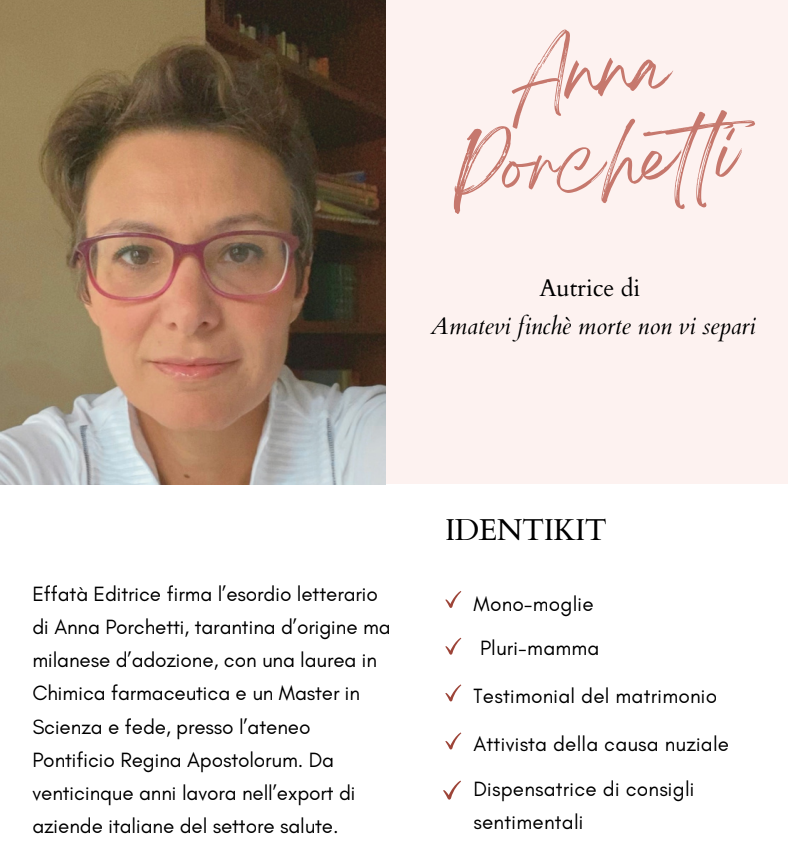 Come affrontare il matrimonio, sopravvivendo alle incolmabili differenze fra uomo e donna, agli errori, alle delusioni che la vita insieme inevitabilmente comportano? Per farlo, ci vuole una ferrea fede nel valore del matrimonio e uno sguardo assieme ironico e benevolo. Occorre imparare a sorridere dei propri difetti e di quelli del partner, praticare regolari esercizi di perdono e di accoglienza. Questi sono solo alcuni dei suggerimenti che l’autrice Anna Porchetti rivela ai lettori in Amatevi finché morte non vi separi (Effatà, 2022).