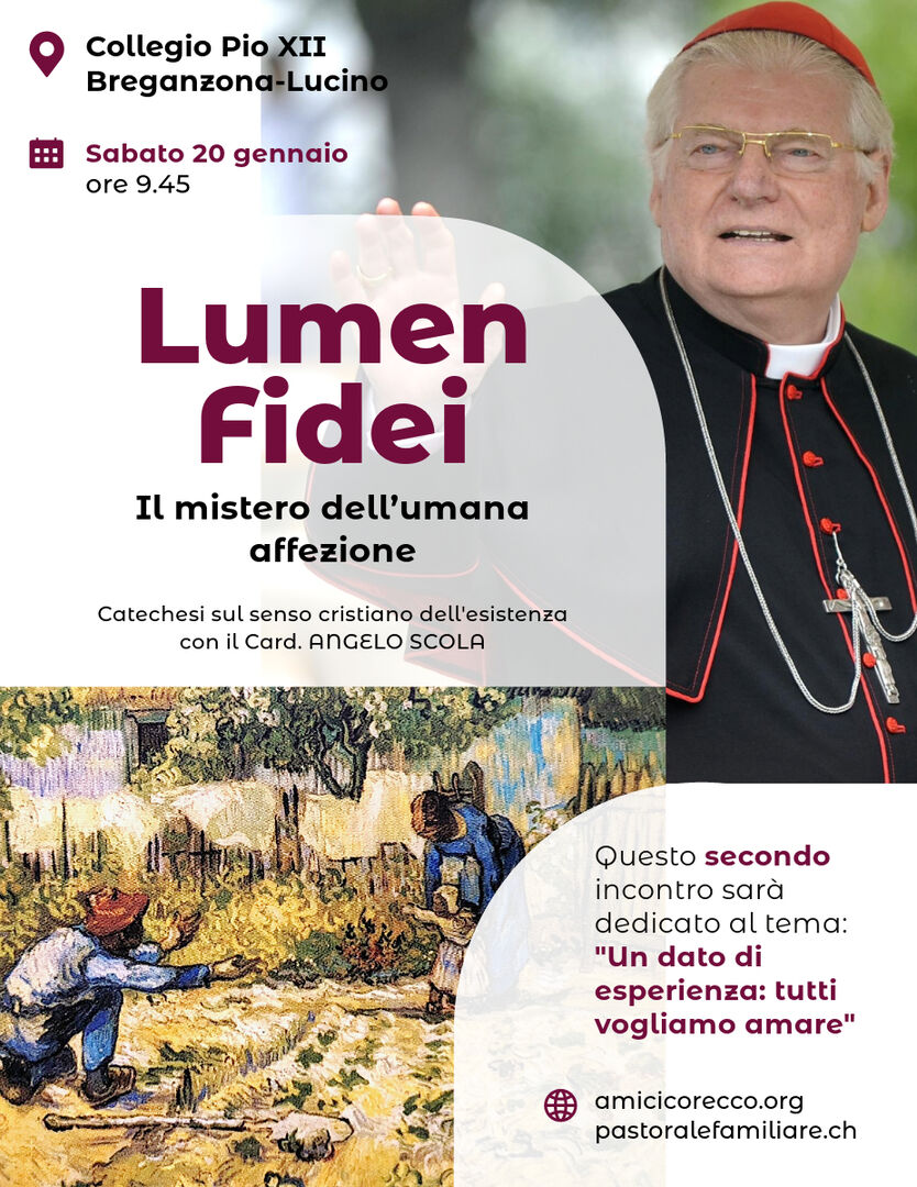 S.E. il card. Angelo Scola, arcivescovo emerito di Milano e presidente dell'Associazione Amici di Eugenio Corecco, propone, sotto il titolo Lumen fidei, una serie di incontri-lezioni per cogliere l’impatto della fede sulla vita.
