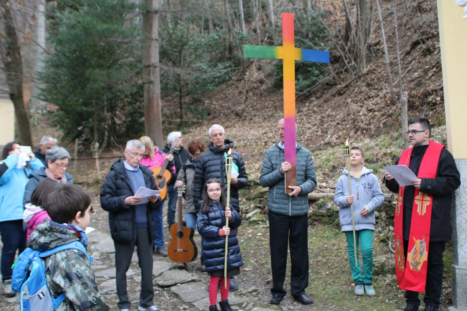 Una sessantina di persone, adulti e bambini, hanno percorso la suggestiva salita alla chiesa dello Zocco, costellata dalle cappelle, portando la croce colorata dai ragazzi della valle. Il gruppo, raccolto e orante, ha trasportato da ogni "stazione" un oggetto simbolico che faceva riferimento alla meditazione proposta. Arrivati in cima al colle, tutti gli oggetti esposti sulla gradinata della chiesetta, che fa da balcone sull'intera valle di Muggio, sono apparsi come un dono presentato a Gesù a conforto e sostegno alla sua passione.