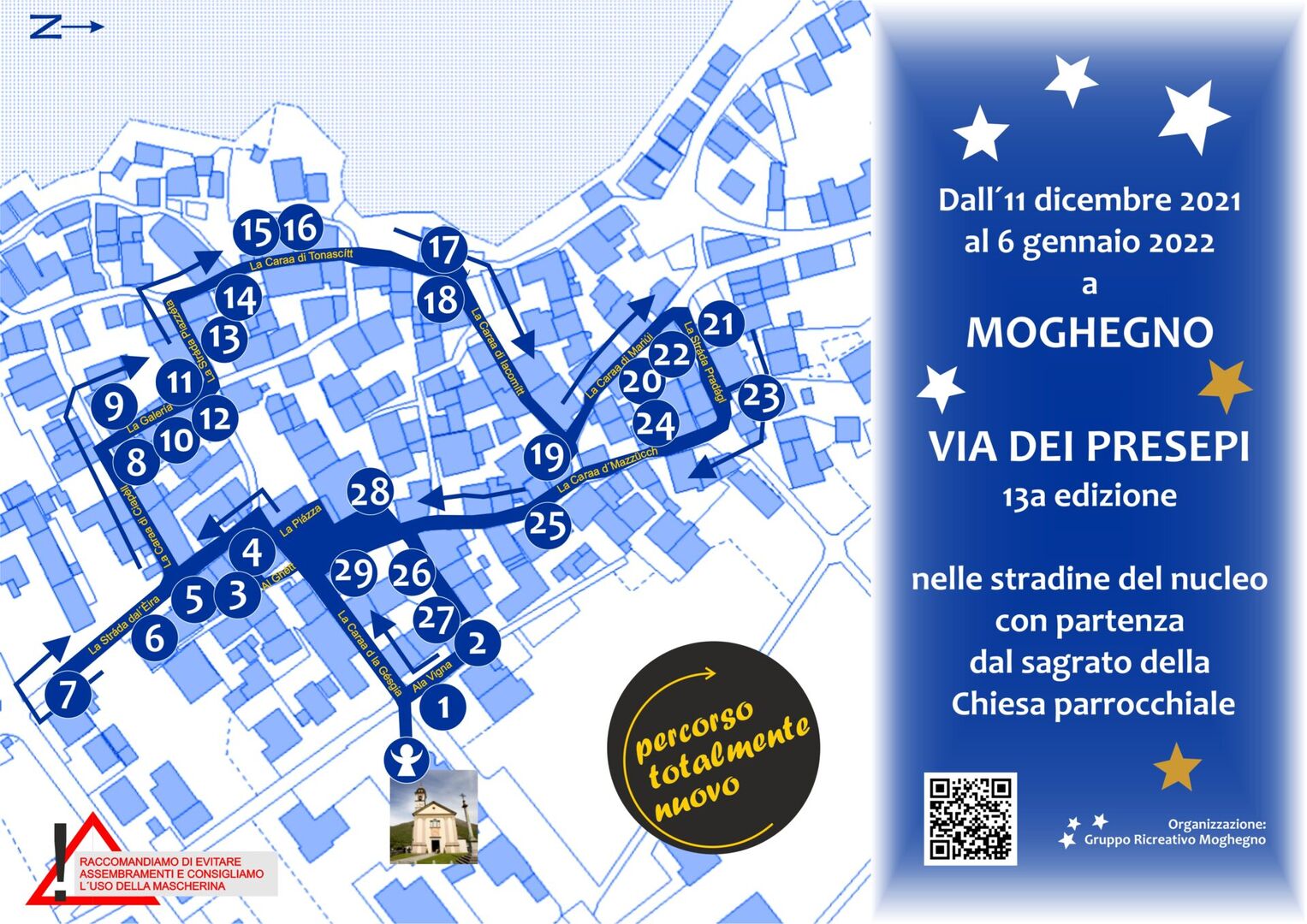Anche quest'anno la Via dei Presepi ha esordito a metà dicembre con diversi concerti collaterali e la tombola di Santo Stefano nel periodo natalizio. Per chi vuole salire a Moghegno c'è la possibilità di visitare un percorso che quest'anno si presenta come "totalmente nuovo" rispetto al passato. La partenza è dal sagrato della chiesa parrocchiale e cammin facendo si visitano 29 natività esposte in esterno fino al 6 gennaio 2022.