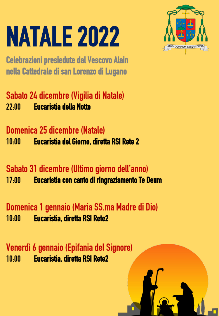 Sabato 24 dicembre, alle ore 22.00, presiede la Santa Messa pontificale della Vigilia di Natale nella Cattedrale di San Lorenzo in Lugano.