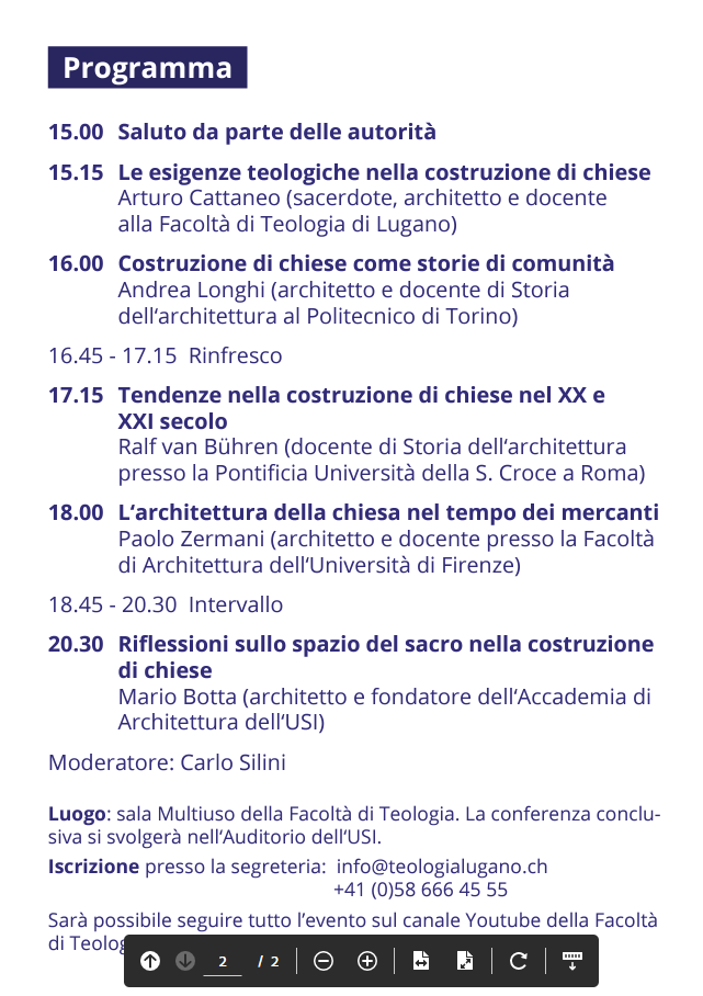 Costruire una chiesa è sempre stato uno dei compiti più difficili per un architetto, per ciò che essa significa, per la realtà così speciale, unica – trascendente – che essa è chiamata ad accogliere e a manifestare. Tale compito si è fatto ancora più arduo nella nostra epoca, dominata dalla secolarizzazione e quindi con una crescente difficoltà a comprenderne il senso della trascendenza, oltre al fatto di aver abbandonato i diversi stili affermatisi nel corso dei secoli. La centralità che le chiese, e soprattutto le cattedrali, occupavano nei centri urbani dei secoli scorsi sta progressivamente scomparendo; esse rimangono tutt’al più come memorie o come servizi. Siamo in una società in cui vengono sempre più a mancare i punti di riferimento, dissolvendosi tutto in una sorta di liquidità. Ciò che sembra mantenere importanza è l’apparire e il consumare. Una «società liquida», come la chiamò il filosofo polacco Zygmunt Bauman, in cui domina la convinzione che «il cambiamento è l’unica cosa permanente e l’incertezza è l’unica certezza». In tale prospettiva non sorprende che Mario Botta abbia visto nella costruzione di chiese «una sfida estrema». Come affrontarla, quali soluzioni proporre? Se ne parlerà nel Convegno su Architettura & Teologia il prossimo venerdì 29 aprile alla Facoltà di Teologia di Lugano.