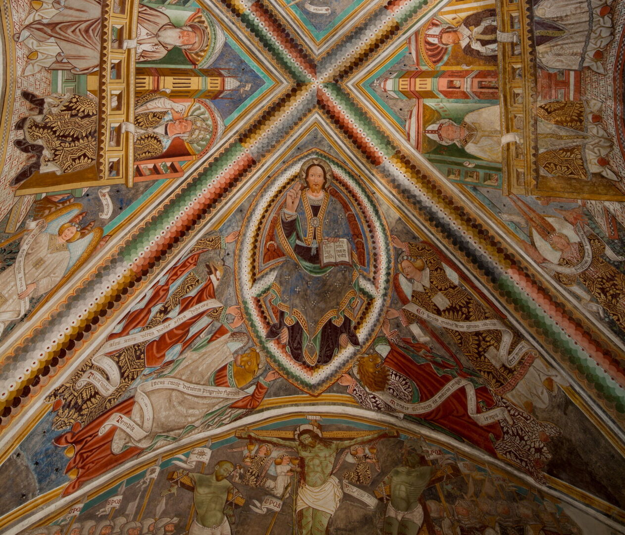 L’intero complesso pittorico è caratterizzato da una notevole ricchezza. «Sulla volta a crociera - ci spiega Ferretti - sono raffigurati il Cristo Pantocratore con i quattro Evangelisti mentre nelle vele i Padri della Chiesa latina, cioè Agostino, Ambrogio, Girolamo e Gregorio Magno, con S. Michele Arcangelo, S. Vittore - patrono dell'antica pieve di Locarno - e S. Abbondio. Sulla parete orientale è invece raffigurata la scena della Crocifissione mentre sulle pareti laterali i dipinti sono suddivisi in due registri: nella parte superiore i dodici Apostoli; nella parte inferiore un interessante ciclo dei mesi all'interno di spesse cornici di colore rosso, al di sopra delle quali sono indicati i nomi dei mesi in lettere gotiche. Nelle lunette laterali, si scorgono due scene relative alla Passione di Cristo: a destra la Preghiera nell'Orto degli Ulivi e a sinistra la Salita al Calvario. Sull'arco trionfale, infine, sono rappresentati S. Agata e due profeti mentre sulla parete settentrionale una Madonna del latte e S. Michele».