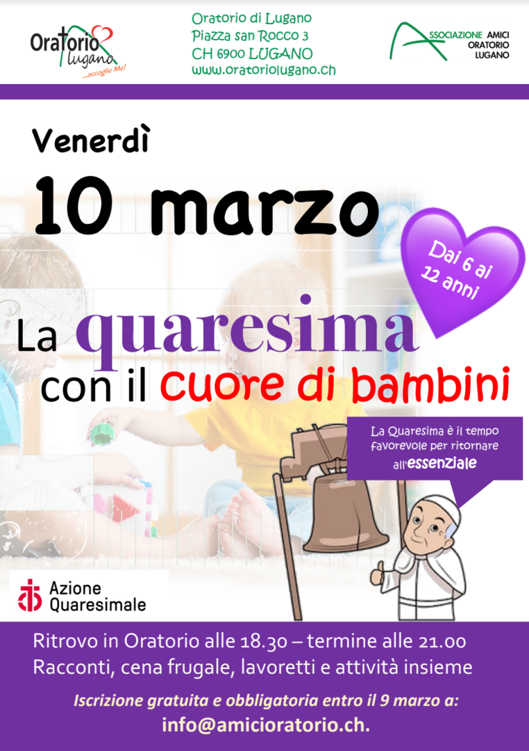 L'oratorio di Lugano invita ad una serata quaresimale dedicata ai bambini. Alcuni catechisti ed educatori dell’Oratorio hanno preparato un programma coinvolgente e dinamico per aiutare i bambini dai 6 ai 12 anni per vivere il tempo di preparazione alla Pasqua. Quaranta giorni favorevoli per vivere qualche rinuncia e approfondire la propria libertà nei desideri del proprio cuore ma anche per educare alla gratitudine di quanto si riceve quotidianamente nei vari ambiti di vita dei nostri bimbi.