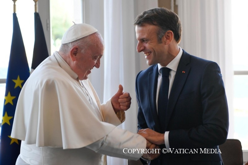 Al termine del discorso il Papa ha incontrato Emmanuel Macron, Presidente della Repubblica Francese.