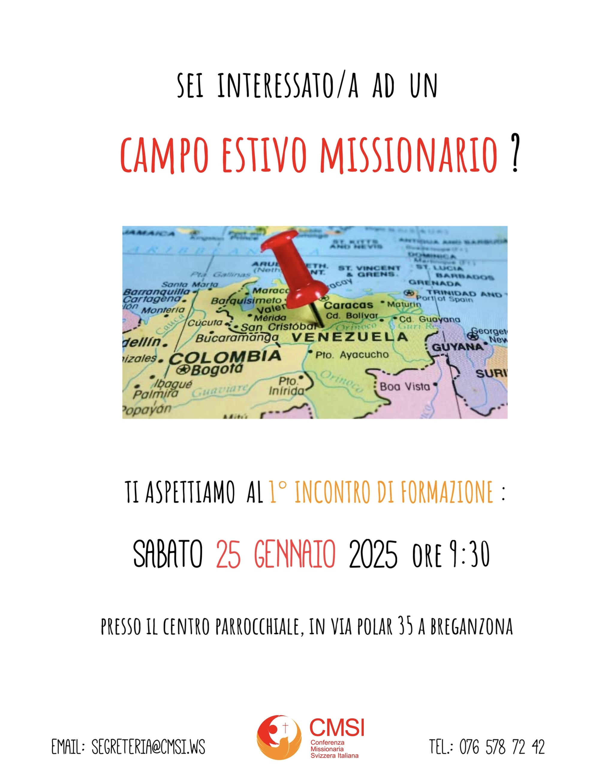 Sabato prossimo 25 gennaio, dalle 9.30 alle 12 a Breganzona, presso il centro parrocchiale in via Giovanni Polar 35, si terrà il primo incontro di formazione per il Campo Estivo Missionario organizzato dalla CMSI (Conferenza Missionaria della Svizzera Italiana).