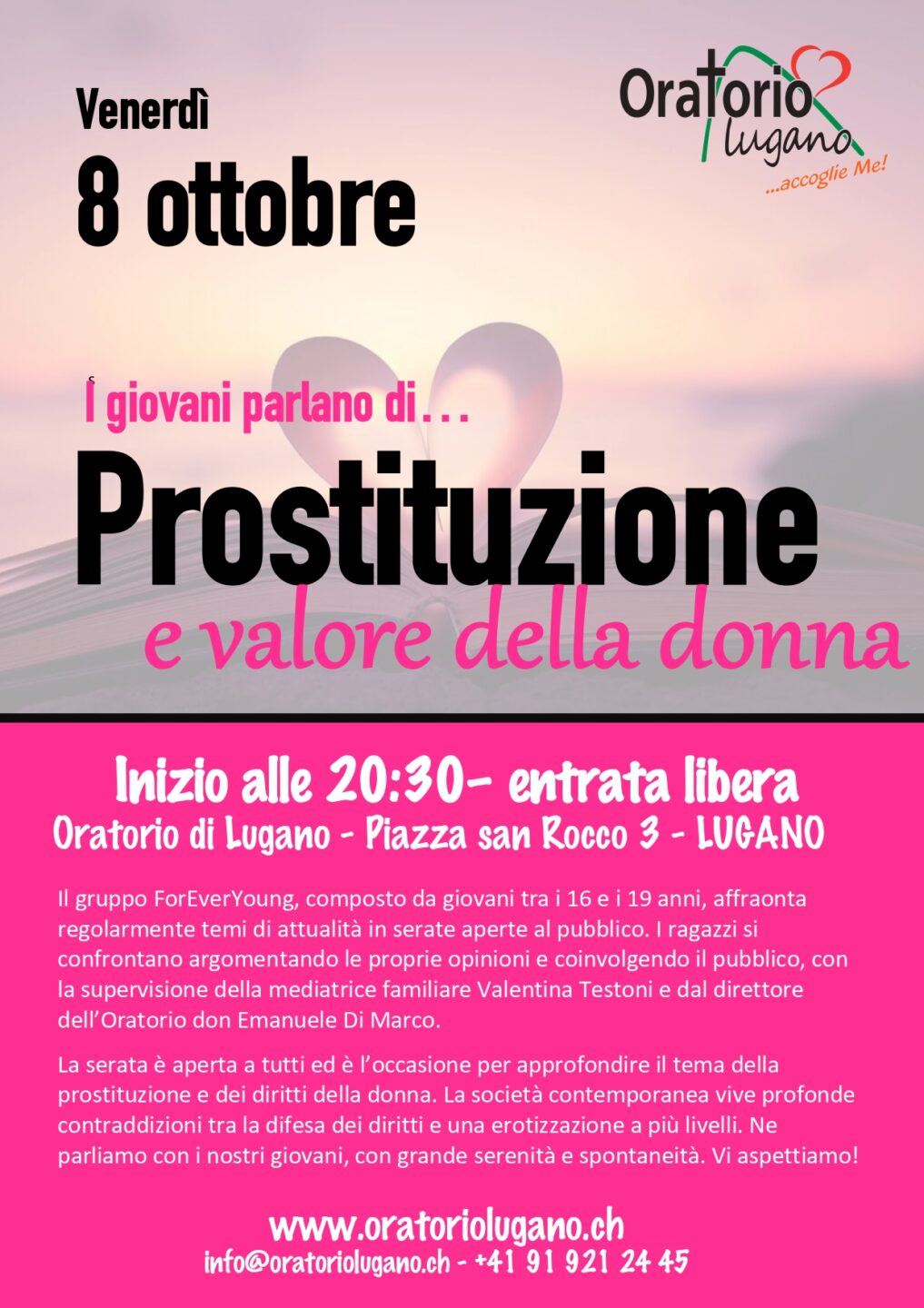 Venerdì 8 ottobre l'appuntamento sarà all'Oratorio di Lugano, alle 20.30, dove i giovani parleranno di prostituzione e valore della donna. "Il desiderio di portare in primo piano questo tema è emerso dalla contraddizione del nostro mondo in cui da una parte si parla di diritti delle donne, mentre dall'altra esse vengono considerate come oggetti. Un altro aspetto sul tavolo sarà la legalizzazione o meno della prostituzione. Il dibattito sarà condotto dai ragazzi ed è aperto agli interventi del pubblico. Solo alla fine io e la mediatrice Valentina Testoni raccoglieremo alcuni spunti per una riflessione dal punto di vista educativo", ci spiega don Emanuele Di Marco.
