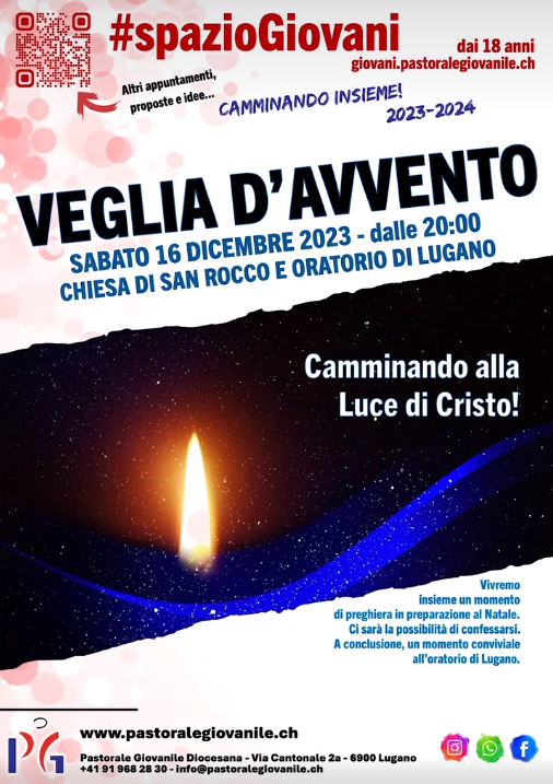 Sabato 16 dicembre, alle ore 20, presso la Chiesa di San Rocco a Lugano si terrà la Veglia di Avvento organizzata dalla Pastorale giovanile (PG) in collaborazione con l’Oratorio di Lugano e gli universitari di Comunione e Liberazione.