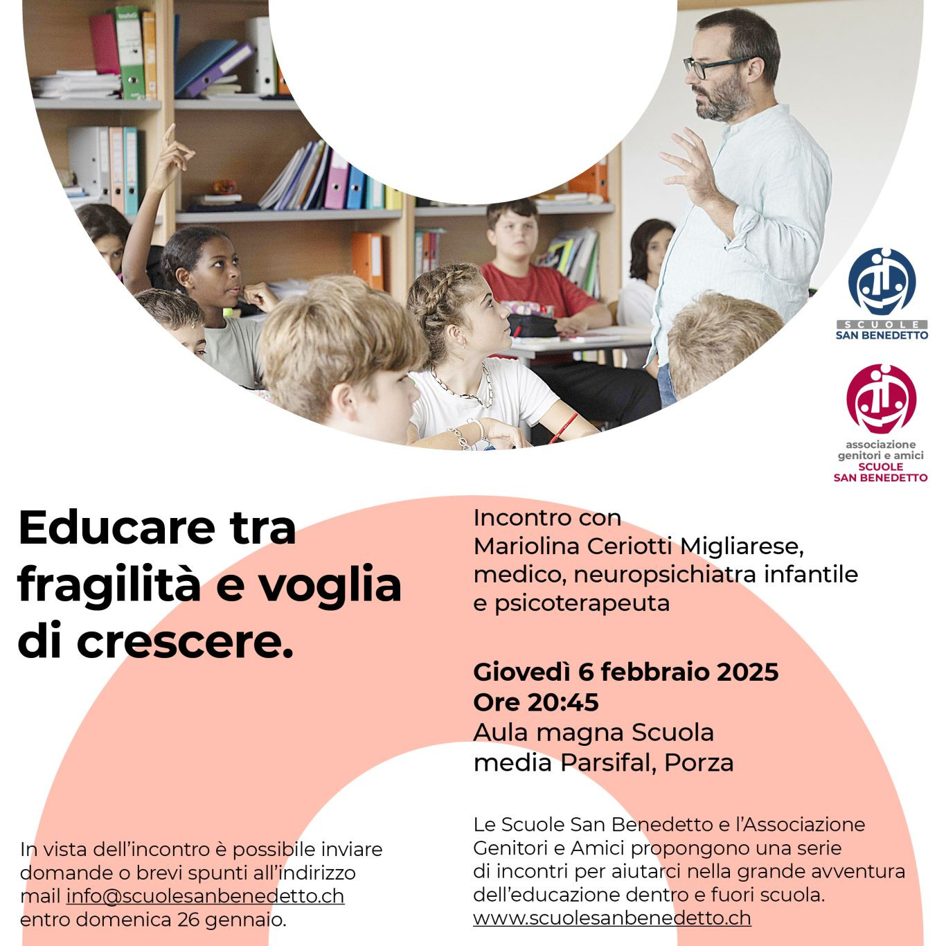 Giovedì 6 febbraio, alle ore 20.45, presso l’aula magna della Scuola Media Parsifal di Porza, si terrà un incontro che promette di offrire spunti preziosi per chiunque si trovi a vivere l’avventura dell’educazione, dentro e fuori dalle mura scolastiche. L’evento, organizzato dalle Scuole San Benedetto in collaborazione con l'Associazione Genitori e Amici, vedrà come protagonista Mariolina Ceriotti Migliarese, medico, neuropsichiatra infantile e psicoterapeuta di grande esperienza. Abbiamo chiesto ad Anna Orlandi, docente delle medie Parsifal S. Benedetto e moderatrice dell’incontro, di introdurci al tema della serata, ovvero "Educare tra fragilità e voglia di crescere".