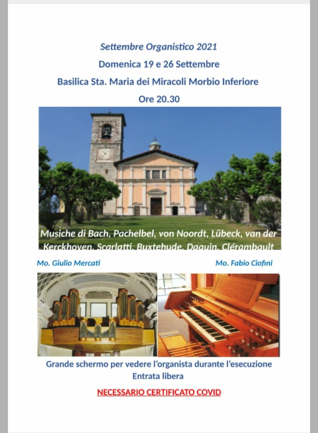 domenica 19 e domenica 26 settembre avranno luogo nel Santuario di Santa Maria dei Miracoli a Morbio Inferiore, con inizio alle ore 20.30, i concerti d'organo nell'ambito del tradizionale Settembre organistico iniziato nel lontano 2001, che raggiunge quest'anno la sua 21esima edizione, nel 20esimo anniversario del nuovo organo della Basilica-Santuario, inaugurato il 06 gennaio 2001.
