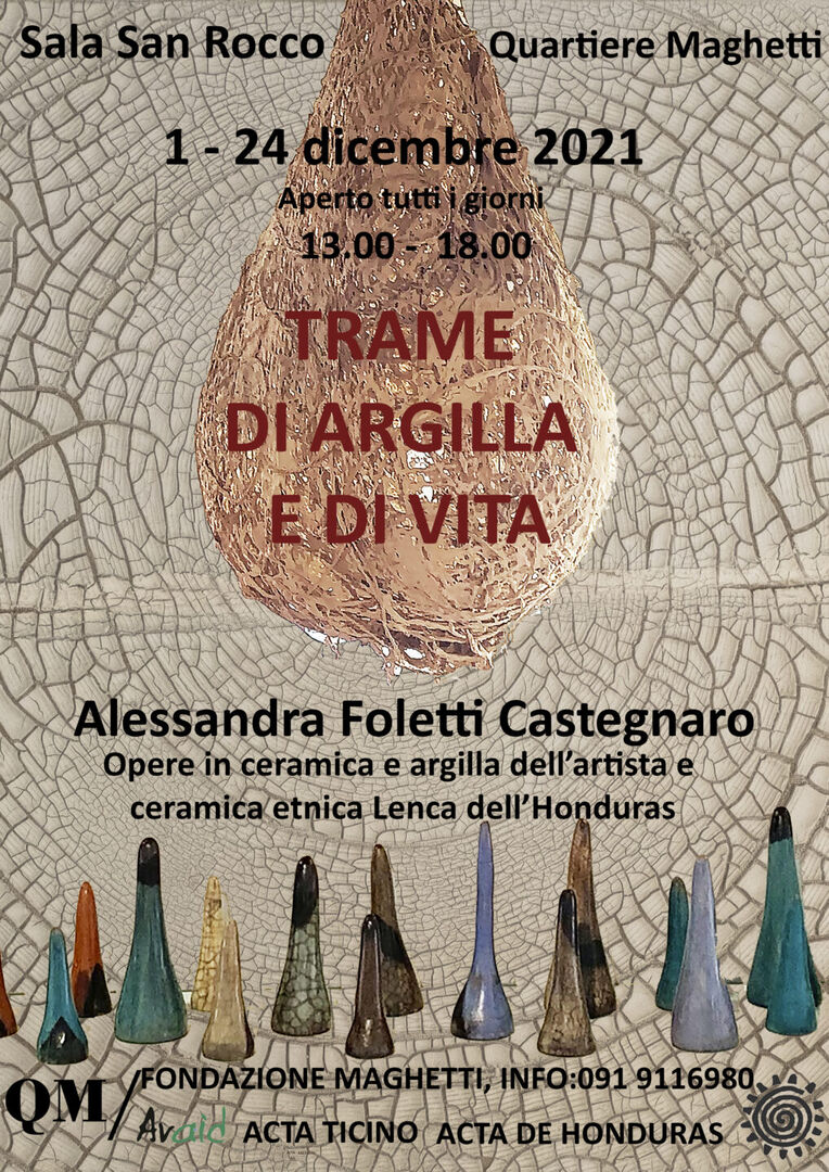 La traiettoria di lavoro artistico e antropologico di Alessandra Foletti-Castegnaro, in mostra alla Sala San Rocco a Lugano per iniziativa della fondazione Maghetti: un’esposizione dove si intrecciano le trame di argilla, con la creatività artistica, con la scelta di vita insieme al marito Carlo per un lavoro di cooperazione in America Latina, con una vita di impegno e condivisione con le popolazioni indigene amazzoniche e centroamericane, in particolare le artigiane lenca dell’Honduras, e con l’accompagnamento da parte degli amici ticinesi dell’associazione ACTA.