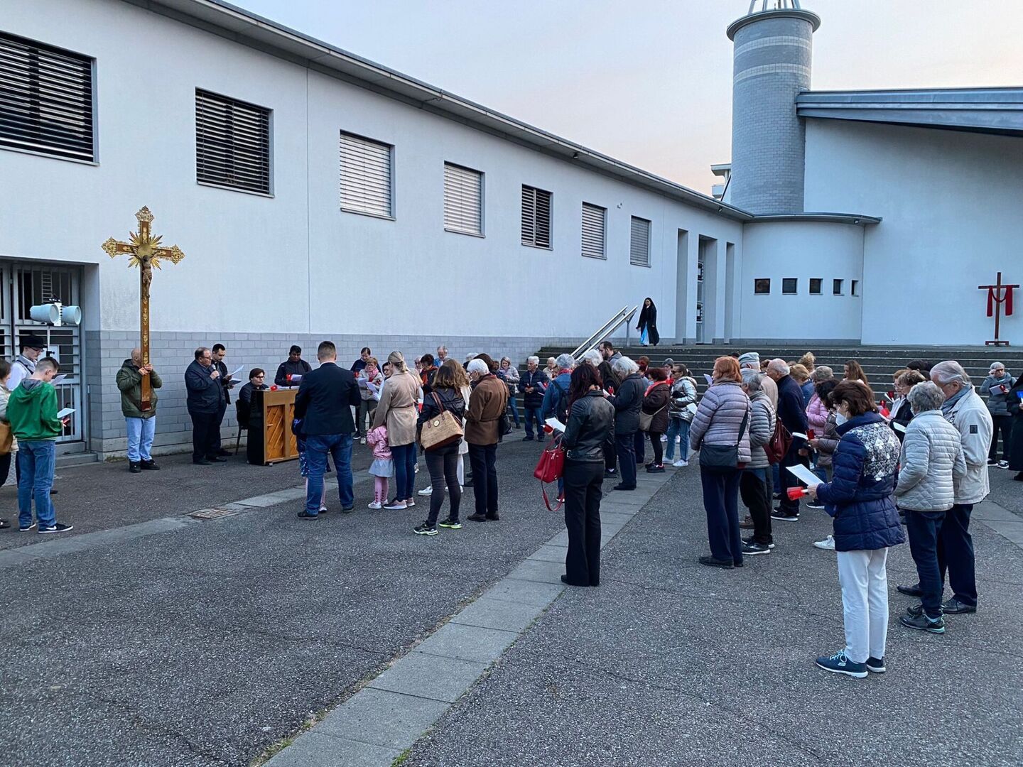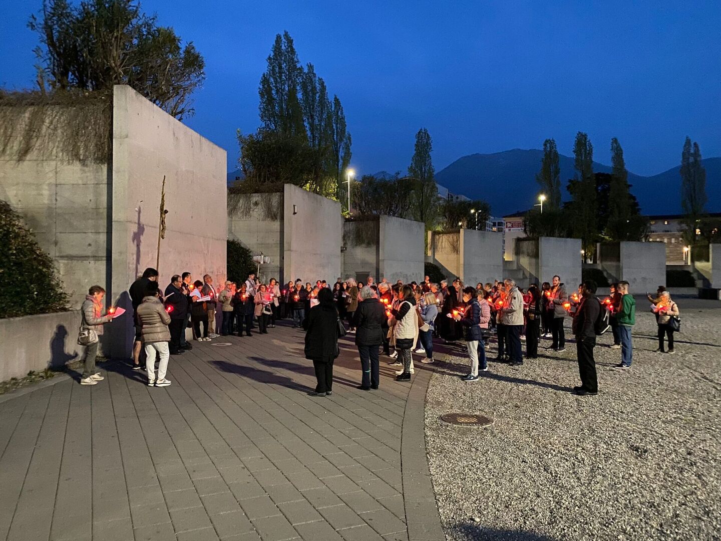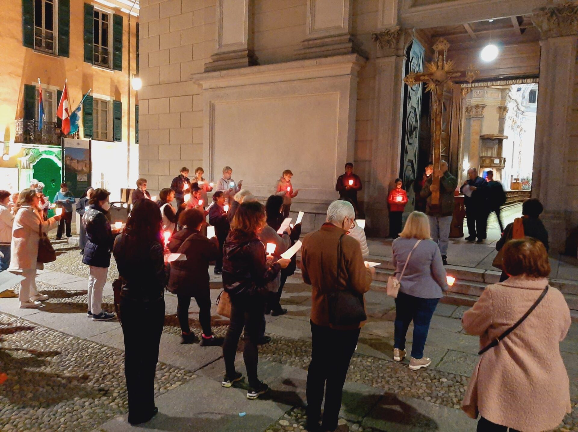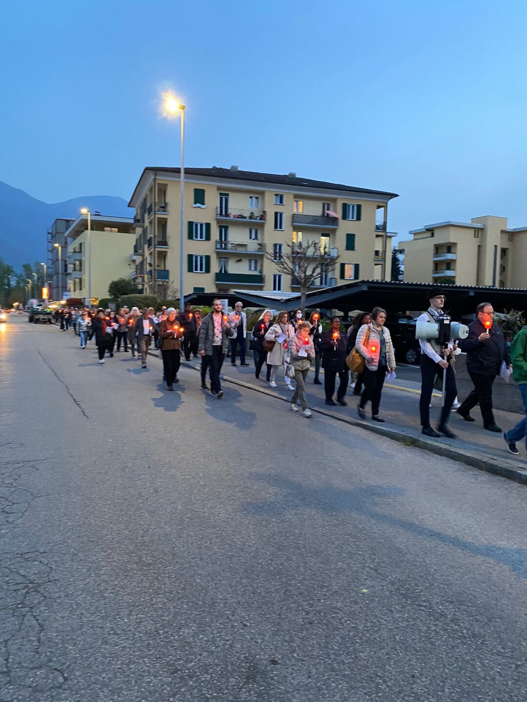Una fiaccolata e una preghiera per la pace, nel cuore della Settimana Santa, per pregare non solo per la guerra in Ucraina, ma anche per tutte quelle guerre – si stima siano oltre 90 – attualmente in corso nel mondo. Tutte nei pensieri degli oltre 100 locarnesi che questa sera si sono riuniti, sollecitati dalla parrocchia di Locarno, per attraversare le vie della Città, partendo dalla chiesa Sacra Famiglia fino a giungere alla Collegiata di S. Antonio. A guidare la meditazione, assieme alla “preghiera semplice” di San Francesco (“O Signore fa di me uno strumento della tua pace!”), anche le parole di Kathrin, giovane siriana, invitata da don Carmelo Andreatta, arciprete di Locarno, a rilasciare la sua testimonianza: “Oggi ai siriani manca tutto: medicine, cibo, beni di prima necessità. Ma colpisce la mobilitazione delle parrocchie, luoghi di accoglienza sin dall’inizio della guerra e l’amicizia solidale, venutasi a creare con il tempo, tra cristiani e musulmani”. Poi la voce di due donne ucraine, di cui sono state lette ad alta voce le riflessioni. Infine, alternati al canto orante e alla preghiera specifica per la conversione dei cuori alla pace, le parole e gli auspici pregnanti di Papa Francesco, che vi riproponiamo: