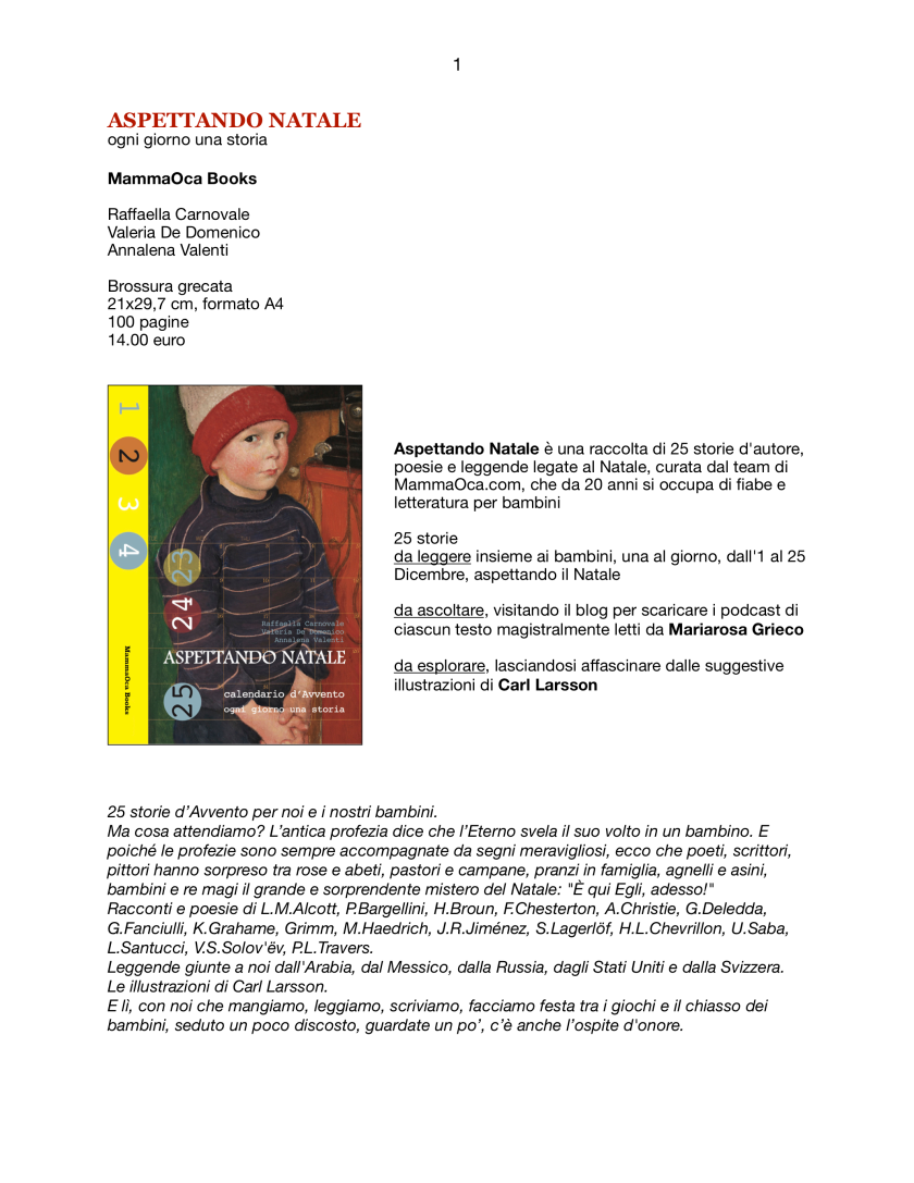 Si tratta di 24 racconti sul Natale tratti dalle opere dei più grandi letterati: Chesterton, Bargellini, Peguy, Solov’ev, Graham Green… Alla sera, prima di andare a letto, perché non leggere un racconto ai bambini? Abbiamo quasi perso questa bella forma educativa. Ogni racconto è illustrato dalle bellissime immagini del pittore Carl Larsson.