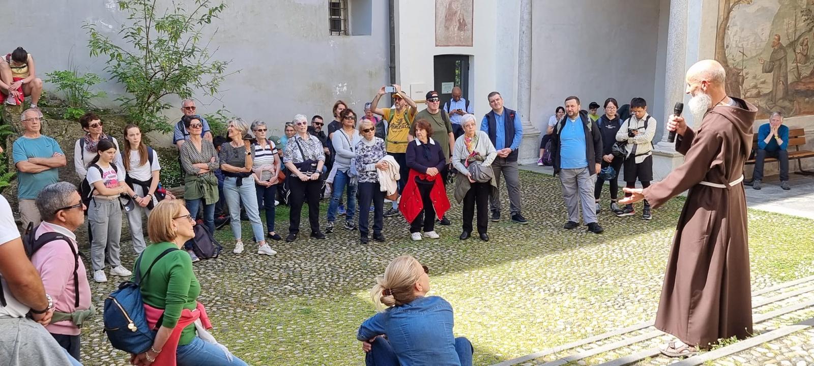 Al Santuario ci ha accolto Padre Agostino, guardiano della Madonna del Sasso, che ci ha raccontato la storia del luogo e i suoi tesori. Uomo gioviale e colto, ha subito adattato il registro alla presenza di una trentina tra bimbi e ragazzi. Così, affascinati dalla narrazione incisiva e sintetica, abbiamo appreso che il Santuario, uno dei luoghi storici e religiosi più importanti del Cantone, è stato fondato a seguito dell’apparizione della Vergine al francescano Bartolomeo da Ivrea. Padre Agostino ci ha suggerito di non mancare la visita di tre grandiose opere d’arte qui custodite : la statua della Madonna del Sasso, la pala della Fuga in Egitto del Bramantino e il Trasporto di Cristo al sepolcro del ticinese Antonio Ciseri. Ma ci siamo commossi anche davanti ai numerosi ex voto, che esprimono la gratitudine per l’aiuto ricevuto in situazioni difficili, e siamo rimasti incantati dalla vista spettacolare sulla città che si gode da questo luogo, costruito su uno sperone di roccia.