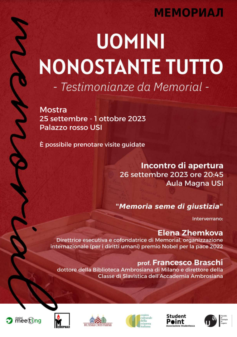 Inoltre martedì 26 settembre alle ore 20:45 nell’Aula Magna dell’Università della Svizzera Italiana (USI), si terrà l’incontro "Memoria seme di giustizia" con Elena Zhemkova, direttrice esecutiva e cofondatrice di Memorial e il prof. Francesco Braschi, dottore della Biblioteca Ambrosiana di Milano e direttore della Classe di Slavistica dell’Accademia Ambrosiana.